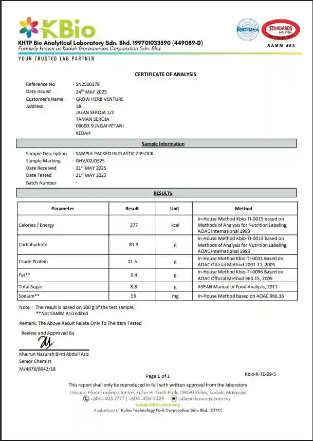 Telah melalui ujian kandungan nutrisi di makmal bertauliah KBio (KHTP Bio Analytical Laboratory)